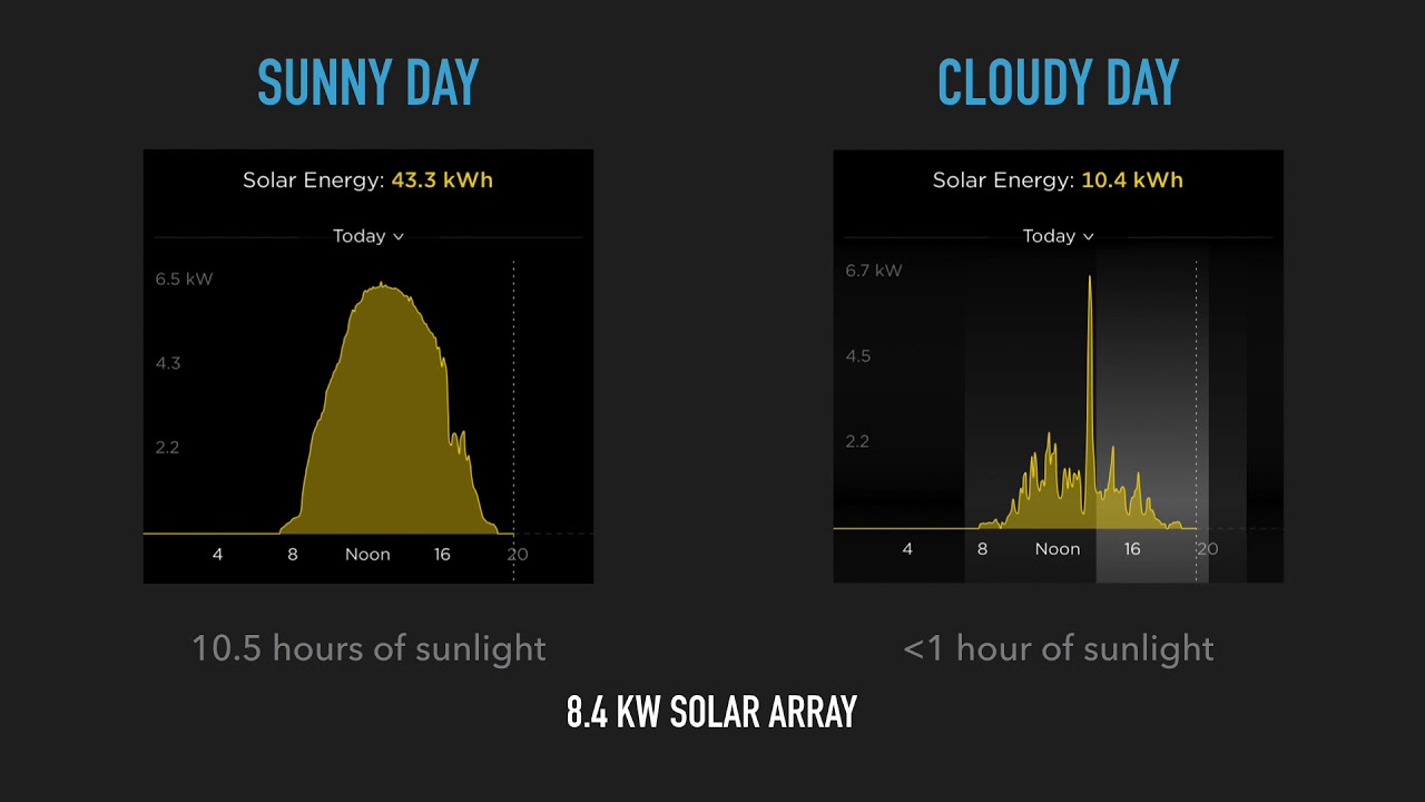 Cloudy days do significantly impact how effectively your solar panels work. For example the following graphs compare the solar irradiance sunlight energy received on a sunny day vs on a cloudy day. On an average overcast day solar panels will typically operate at around 25 of their normal output.
